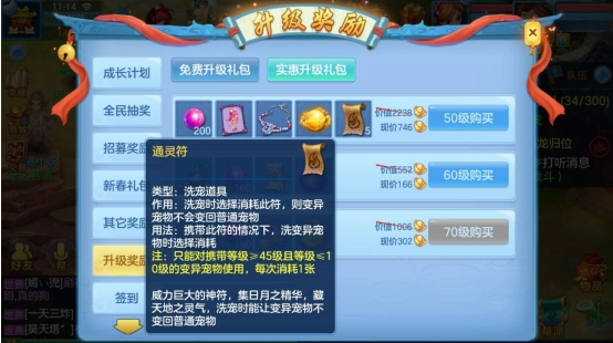 获取通灵符的途径之一是购买升级礼包。具体操作是点击人物头像左侧的奖励按钮,然后选择升级奖励即可查看。当玩家等级达到50级时,可消耗746元宝购买该升级礼包,礼包内包含5个通灵符。对于打算卡50级的玩家来说,这个礼包值得推荐,此外礼包中还有一个银河加护道具,能尝试运气。