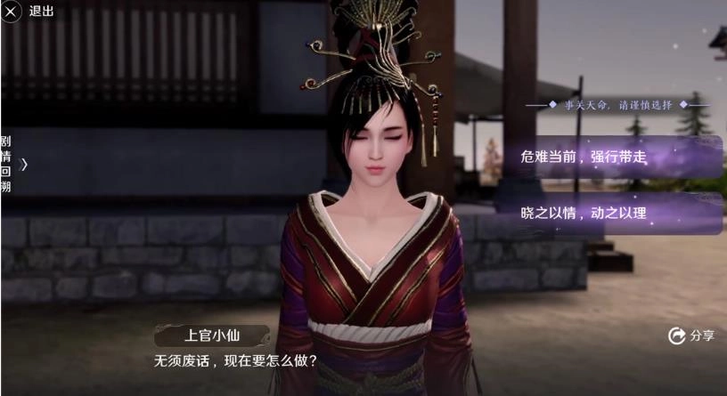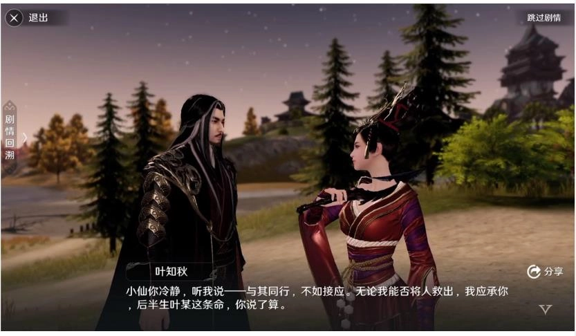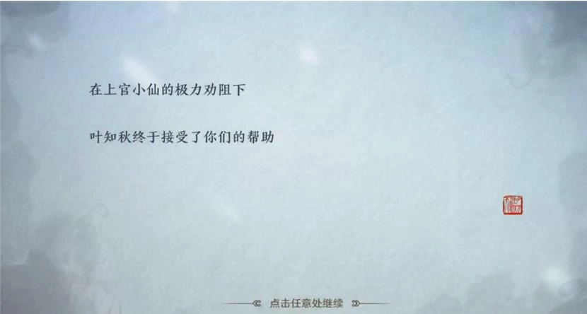 叶知秋为了破除孤星宿命,独自骑马前往辽邦基地营救伙伴钟舒文。途中遇到上官小仙后会出现一个对话框,玩家需要做出两个关键选择,这些选择将直接决定故事走向不同的结局。