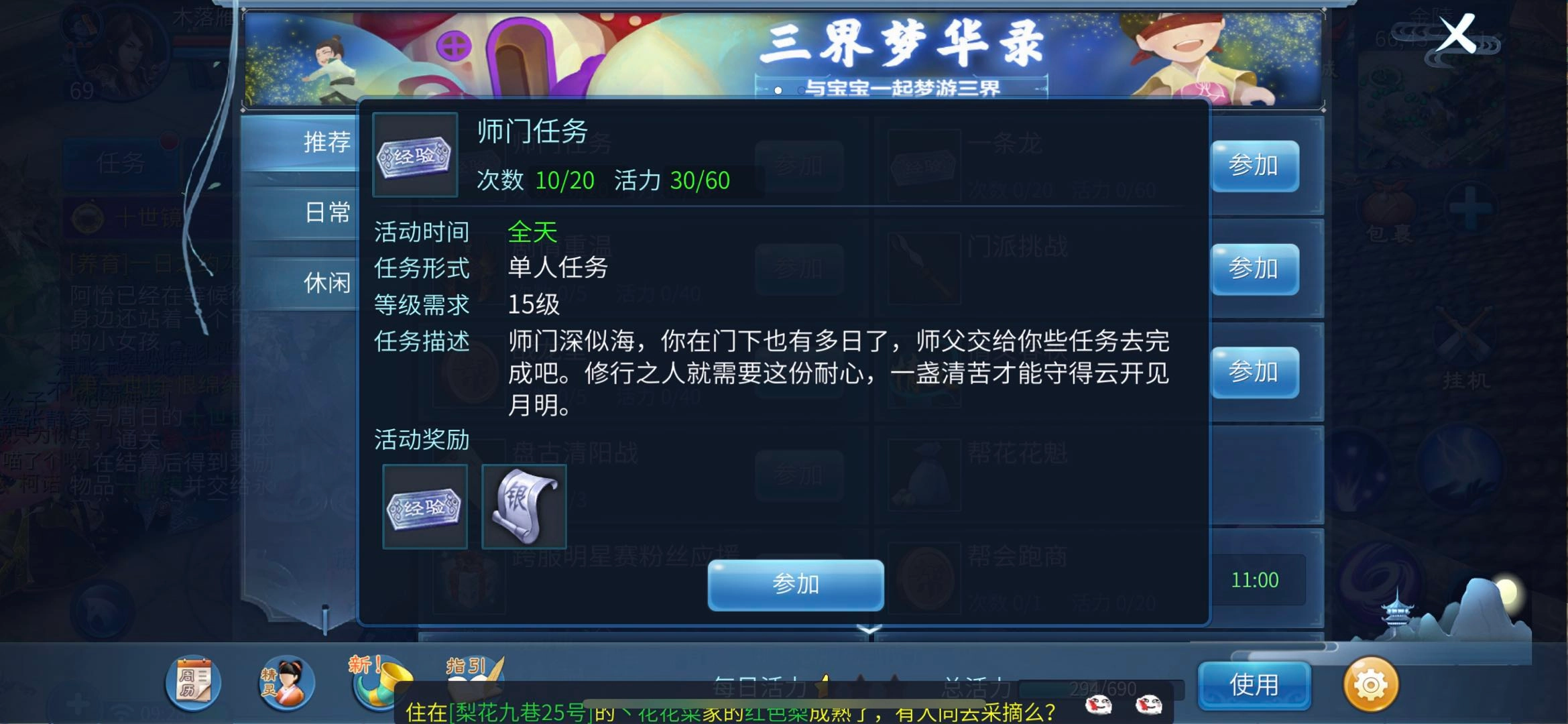在《倩女幽魂》中,师门任务与一条龙任务是玩家日常接触较多的环任务类型。环任务指的是由若干个同类任务组成一轮的任务形式,其中师门任务属于完成速度较快且奖励丰厚的环任务。该任务每日设有两环,总计二十次,任务内容相对简单,无需像一条龙任务那样逐个挑战副本,玩家通常仅需十几分钟即可完成全部流程。