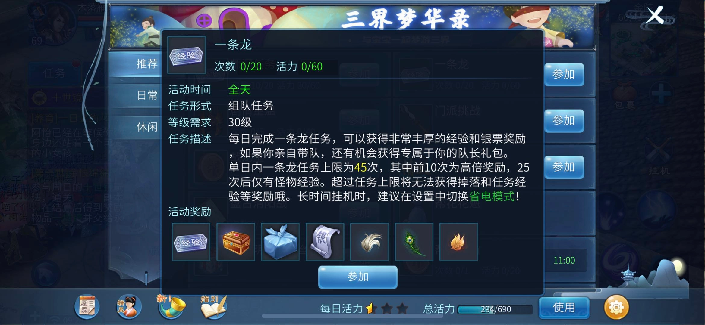 玩家每天得完成五轮一条龙任务,每轮包含五个任务,这意味着要下五个副本。每个副本里都有至少几十只怪物和一个大boss,玩家得把它们全清理完才算完成任务。和师门任务比起来,一条龙任务耗时更长,但玩家能从中获得比师门任务多得多的经验,升级速度也更快。