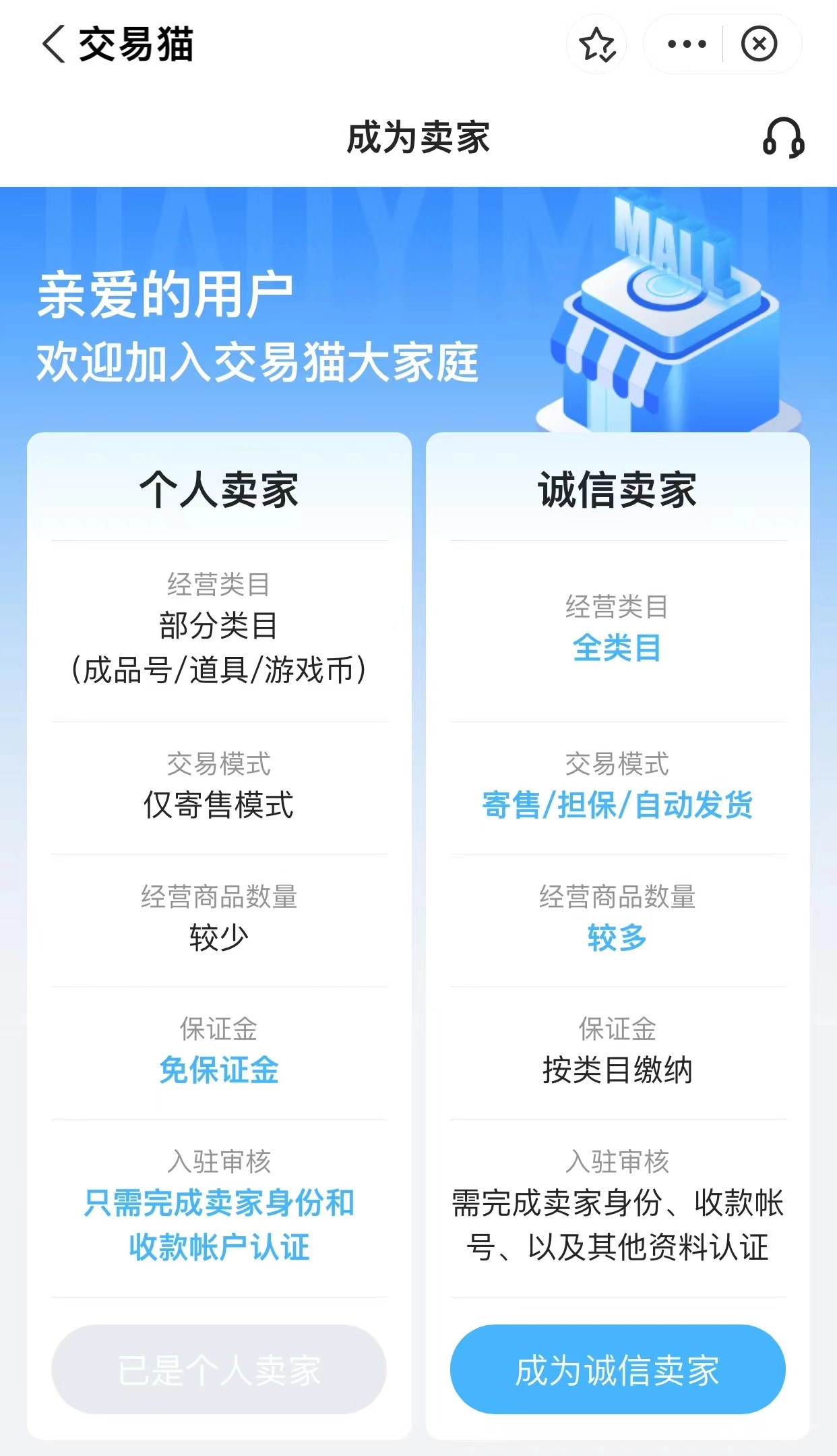 交易猫为卖家提供了丰富的选择,除了成为个人卖家外,玩家还能自主补充更多资料认证为诚信卖家,从而在平台经营全类目商品,交易方式也会更灵活多样。玩家可依据自身实际需求选择合适的卖家类型,无论哪种类型,都能在平台安全保障下进行账号交易,让玩家安心售出游戏账号,顺利脱坑回血,收回部分投入,相比账号闲置无疑更划算。