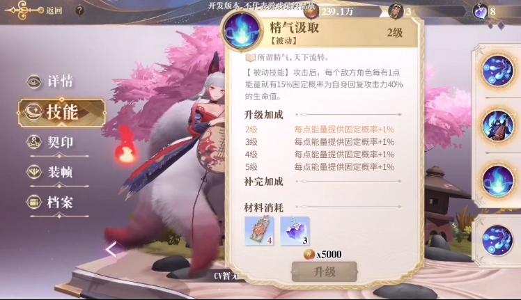 婴宁的被动技能“精气汲取”,会在她发起攻击后,依据敌方角色的能量槽状态,以一定概率为自身恢复生命值,恢复量相当于她攻击力的百分之四十。凭借这个被动技能带来的可观吸血效果,实战中婴宁的血量通常能保持在较高水平。作为群攻幻书里自保能力顶尖的角色,玩家无需担忧战斗时婴宁会出现血量不够的问题。