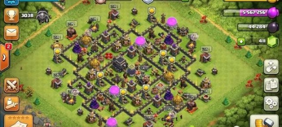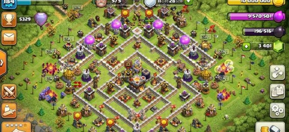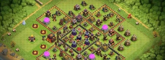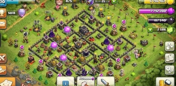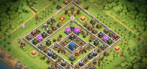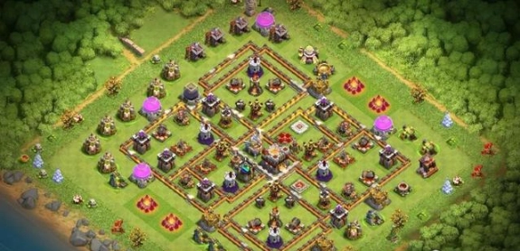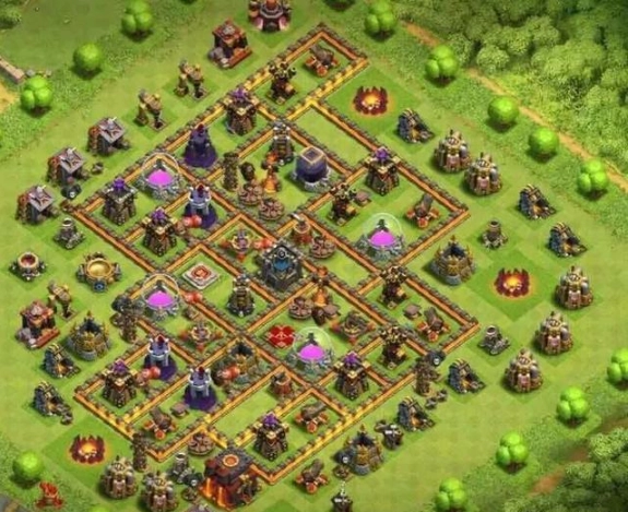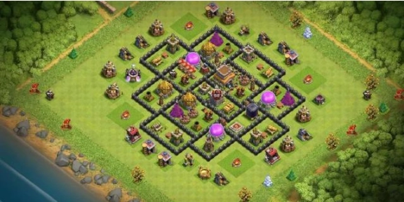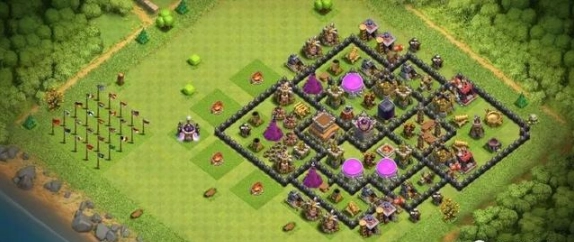 这个阵型是八本毕业阵,八本阶段使用效果不错,护资源和防御能力都挺强,也适合用来冲杯。不过要是用来打部落战的话,表现就不太稳定了。