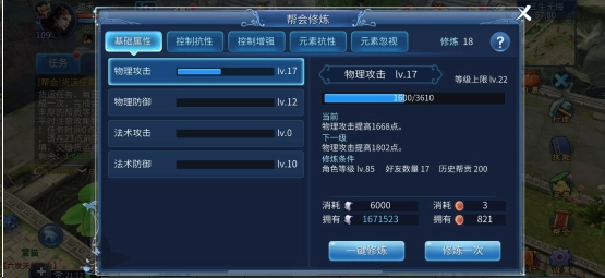 玩家加入帮会之后就能开启修炼升级,每提升一点修炼等级,都要消耗两点帮贡,同时还需要花费一定数量的帮贡以及大量银票。