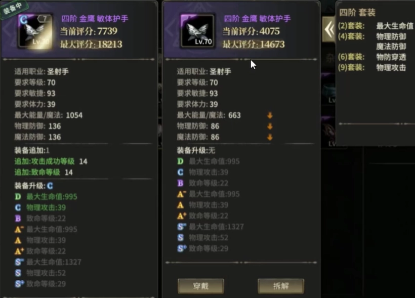 另外要注意的是,套装效果需要集齐相应件数才能生效。毕竟4级以上的套装不仅能提供丰富的基础属性,还会附加额外的特殊属性,最高可触发9件套的完整效果。所以玩家在升级紫色品质装备时,得先确认套装是否能凑齐——要是能集齐一套,70级以内的所有副本都能顺利通关,而且这套装备还能用上很长一段时间过渡。建议大家尽早搭配使用哦!