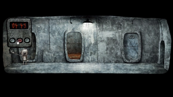 回到刚才的房间,走上右侧的楼梯,进入一个安全的房间。通过天文望远镜,能看到那个胖子机器人正把一个疑似炸弹的物品,安装在一栋高空建筑下方极为隐蔽的角落。随后,在门的近旁能看到一个按钮,机器人按下它后,周围瞬间陷入黑暗,唯有夜光钟依旧亮着,指针指向04:45。