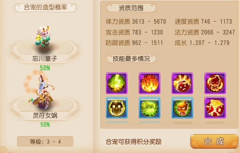 宠物合成有着明确的前提条件,只有自己捕捉或购买的宠物才能参与合成。合成后的新宠物会随机继承原来两只宠物的战技——这意味着,如果参与合成的两只宠物属性不同,新宠物就有机会获得双属性技能。拥有了这样的技能,面对那些特定阵容和队伍时,自然更有底气了。 不仅如此,合成后宠物的攻击、防御、法力、速度、体质资质以及成长值,大多会在两只原宠物的平均值上下浮动。只有极少数运气极佳的玩家,才能得到“青出于蓝而胜于蓝”的高资质宠物,这类宠物的稀有程度也可想而知。