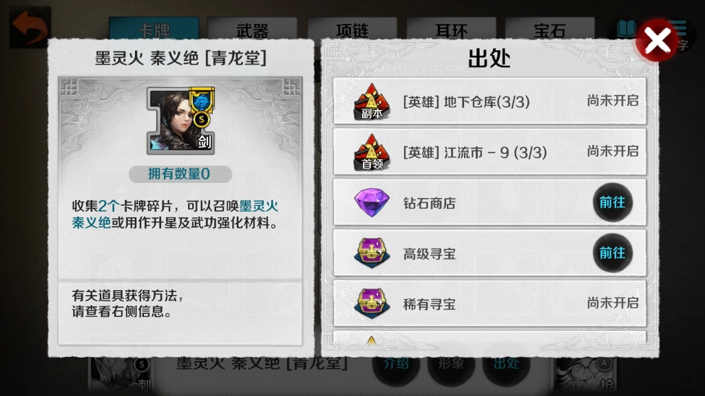获取秦义绝的第三种途径是游戏里的英雄关卡,江流市和地下仓库这两个关卡都能产出相关碎片。开启英雄难度的前提是,玩家得先把对应关卡的普通难度打到满星通关。需要注意的是,英雄难度下碎片是概率掉落的,因此玩家可以多尝试几次通关来收集。