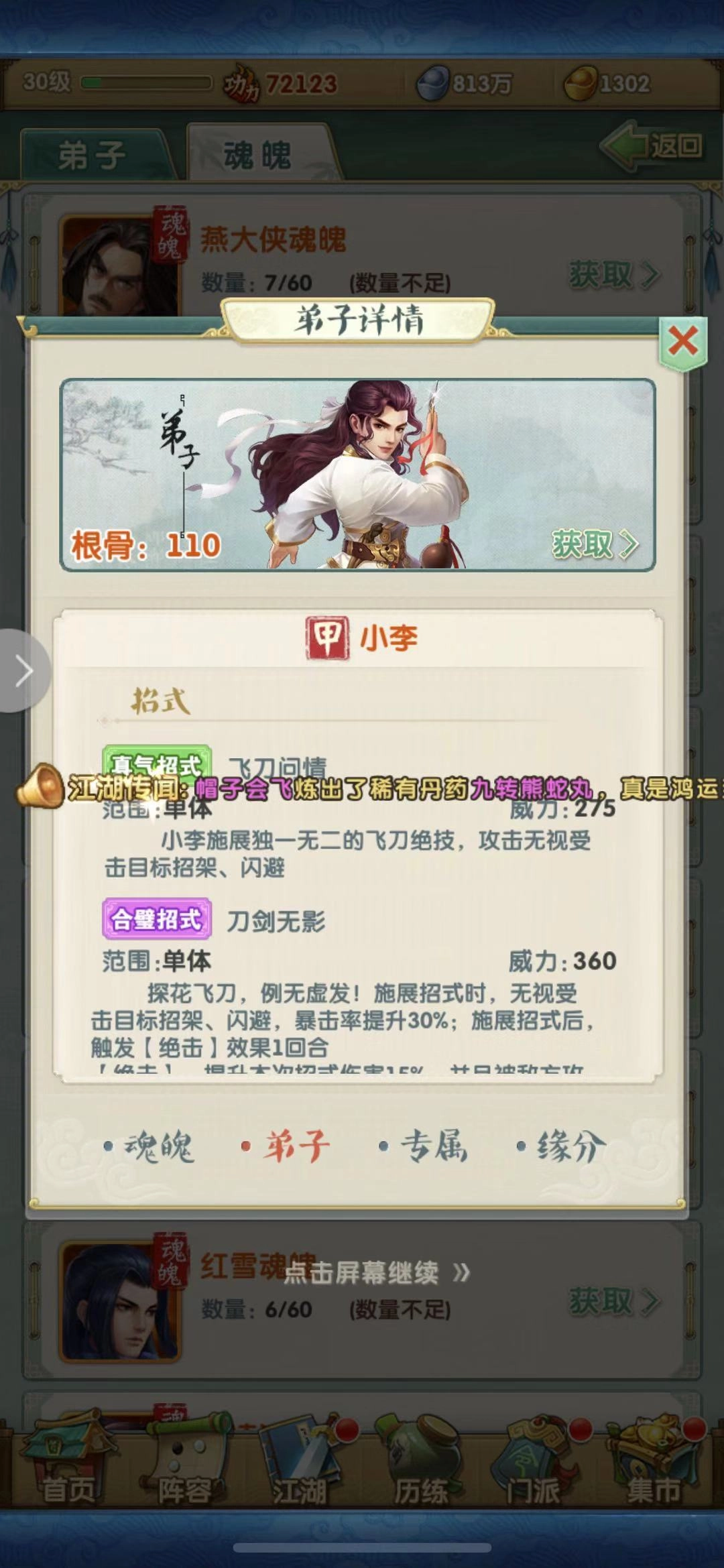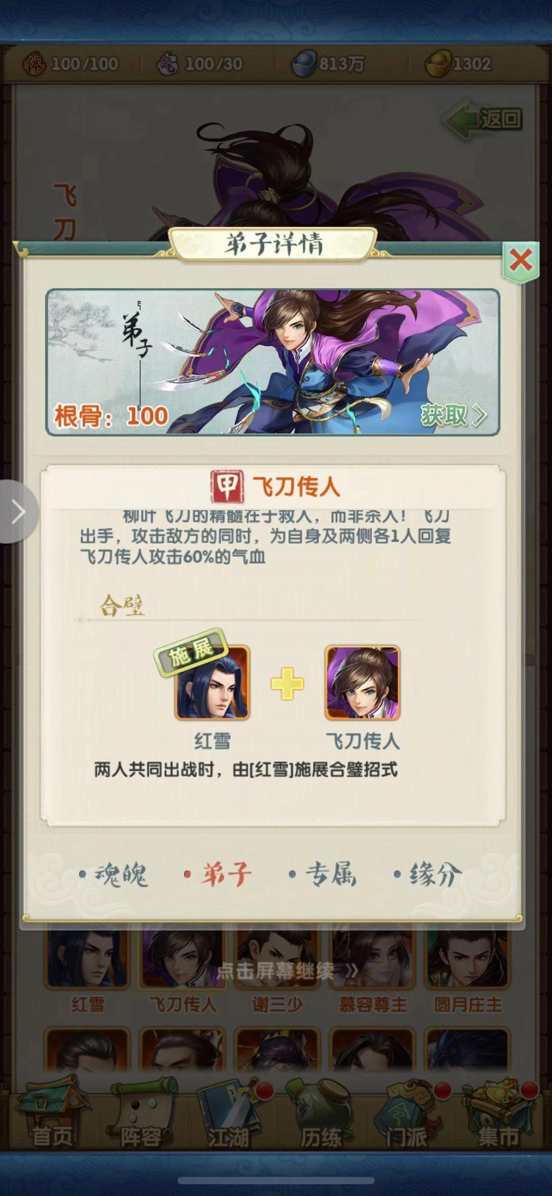 阿飞的技能输出是普通伤害量,自身防御和血量也不算高,但他的技能有个关键作用——能为左右两侧的英雄补充真气值。小李飞刀最依赖的就是真气,阿飞每回合都能帮小李积攒真气,让小李能在短时间内多次释放技能,从而确保阵容的输出稳定。