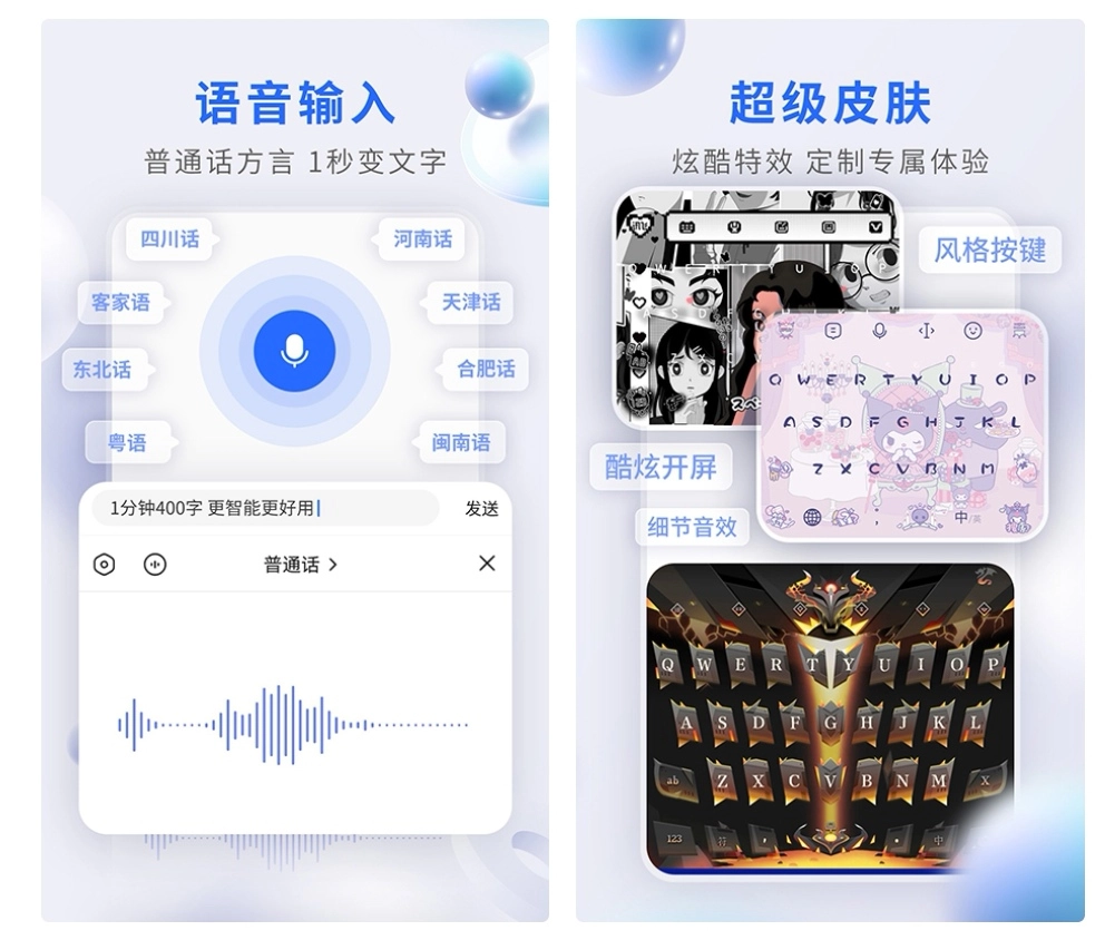 支持拼音输入、语音输入、笔画输入、手写输入等等,选择自己擅长的方式去练习,里面还有非常多的皮肤可以去选择应用到你手机的键盘上。