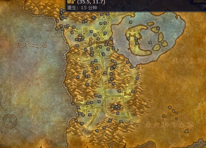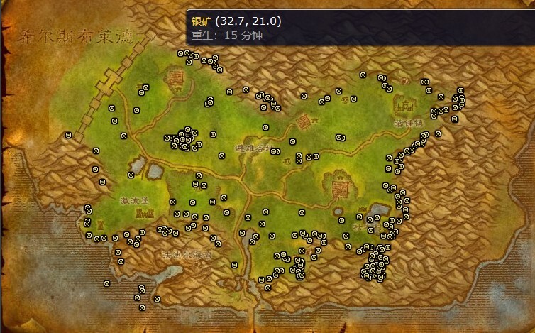 这几张地图有银矿分布,像阿拉希高地、奥特兰克山脉、荒芜之地、暮色森林、银松森林都在列。不过这些地图的银矿产出量相对较少,所以建议玩家要么换其他地图挖银矿,要么带上能提升挖矿效率的装备再去这些地方开采。