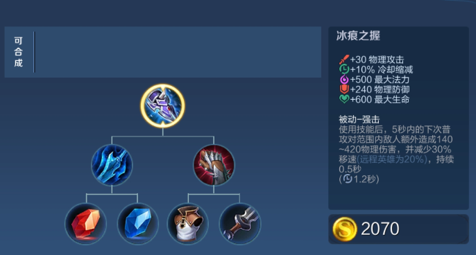 虽然冰痕之握被划分在防御装备类别里,但千万别低估它的功能性——搭配上阿古朵大招召唤的球球的坦度,绝对算得上团战里的“恶霸”级存在。再说说装备属性,冰痕之握的属性相当全面:能给阿古朵加30点物理攻击,提升输出能力;10%的技能冷却缩减,算上其他加成的话冷却缩减基本就满了;还有500点法力值和600点最大生命值,甚至连物理防御都加了240点,简直是各项属性都照顾到了。更关键的是,释放技能后接普通攻击还能触发减速效果,完全是追人必备的神装!