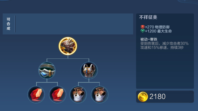 所有塔克英雄必出的装备,并且不祥征兆的被动效果会让攻击者减速,对阿古朵来说是个绝对好的装备。该装备为阿古朵提供270的物理防御以及1200的最大生命值,球球直呼肉的不行!
