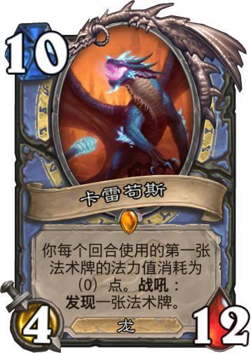 即使没抽到卡雷苟斯也不用发愁,法师新卡中的碧蓝龙探险者,战吼效果能发现一张龙牌,说不定就有机会拿到它啦!