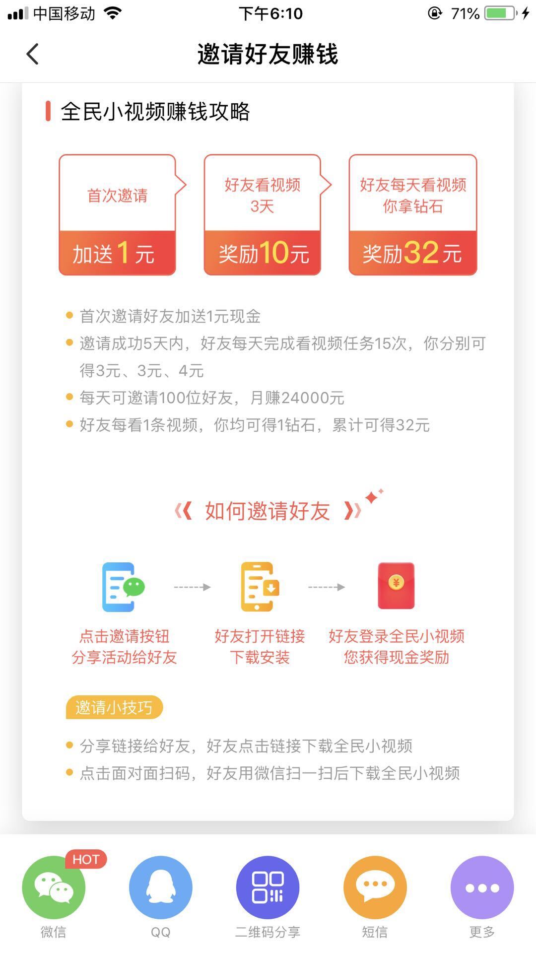 第二种形式:邀请好友下载全民小视频就能领到钻石;