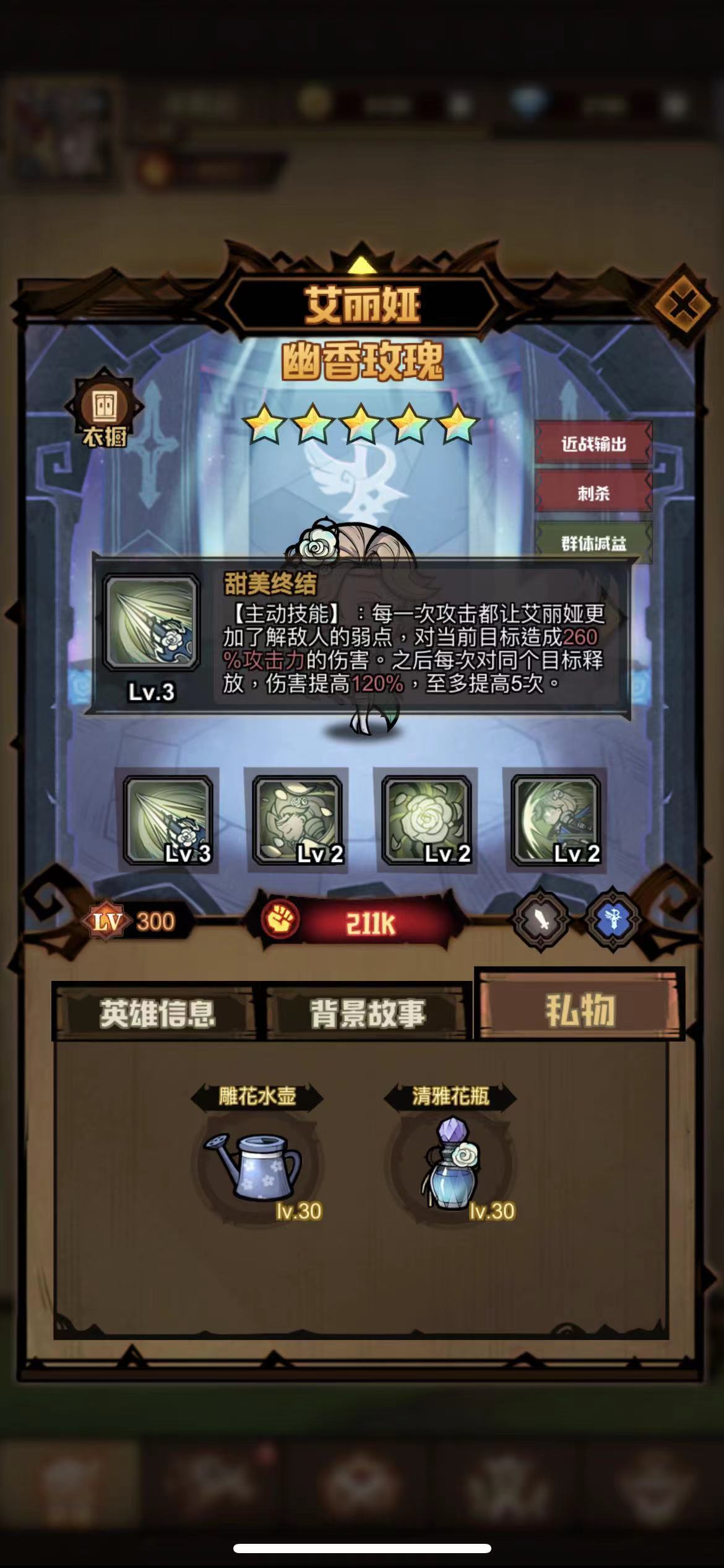甜美终结:主动技能,艾丽娅的每一次攻击都会加深她对敌人弱点的洞察,首次对目标发动时造成260%攻击力的伤害,后续每次针对同一目标释放,伤害将提升120%,该效果最多可叠加5次。