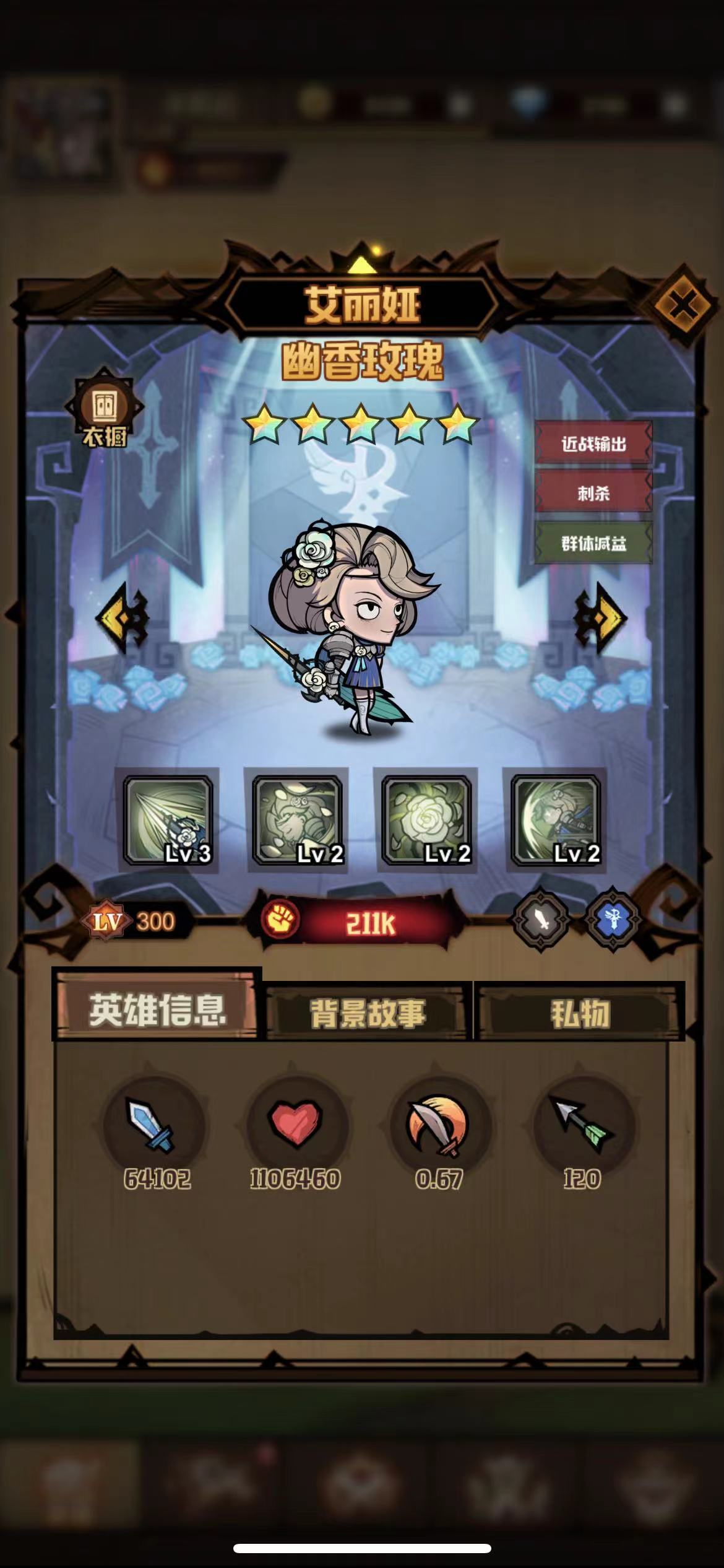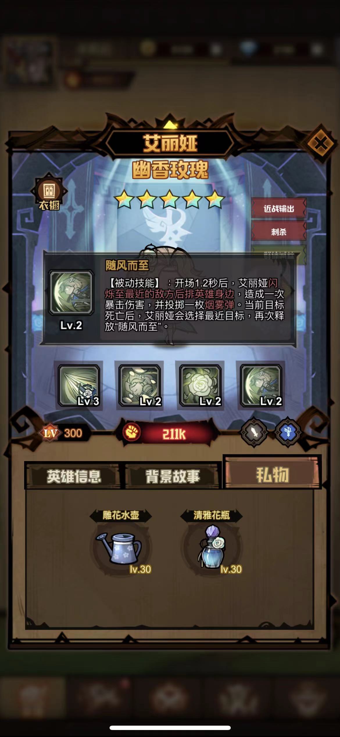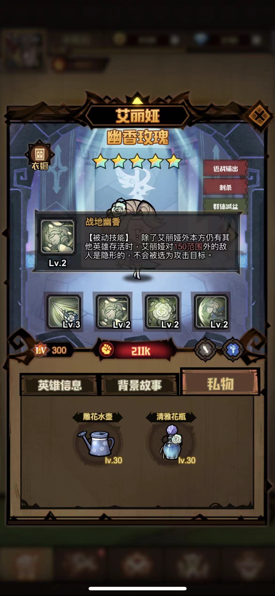 占地幽香:被动技能,当我方除艾丽娅外还有其他英雄存活时,艾丽娅对150范围以外的敌人处于隐形状态,且不会被选定为攻击目标。