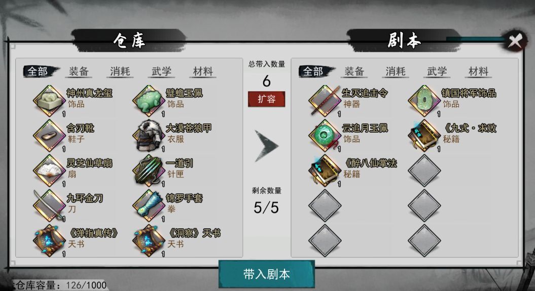 结算存档时,所有金色及以上品质的装备(包含角色身上已穿戴的)、武功秘籍、天赋天书、各类道具,以及所有品质的传家宝,都会自动存入仓库。