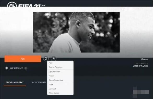 在Origin平台下载游戏时,只要选择对应的语言,就能获取相应的语言包(至少支持英文和中文)。已经完成下载的玩家,可以在Origin界面中找到FIFA 21的游戏属性(Game properties)选项,具体位置如下图所示。