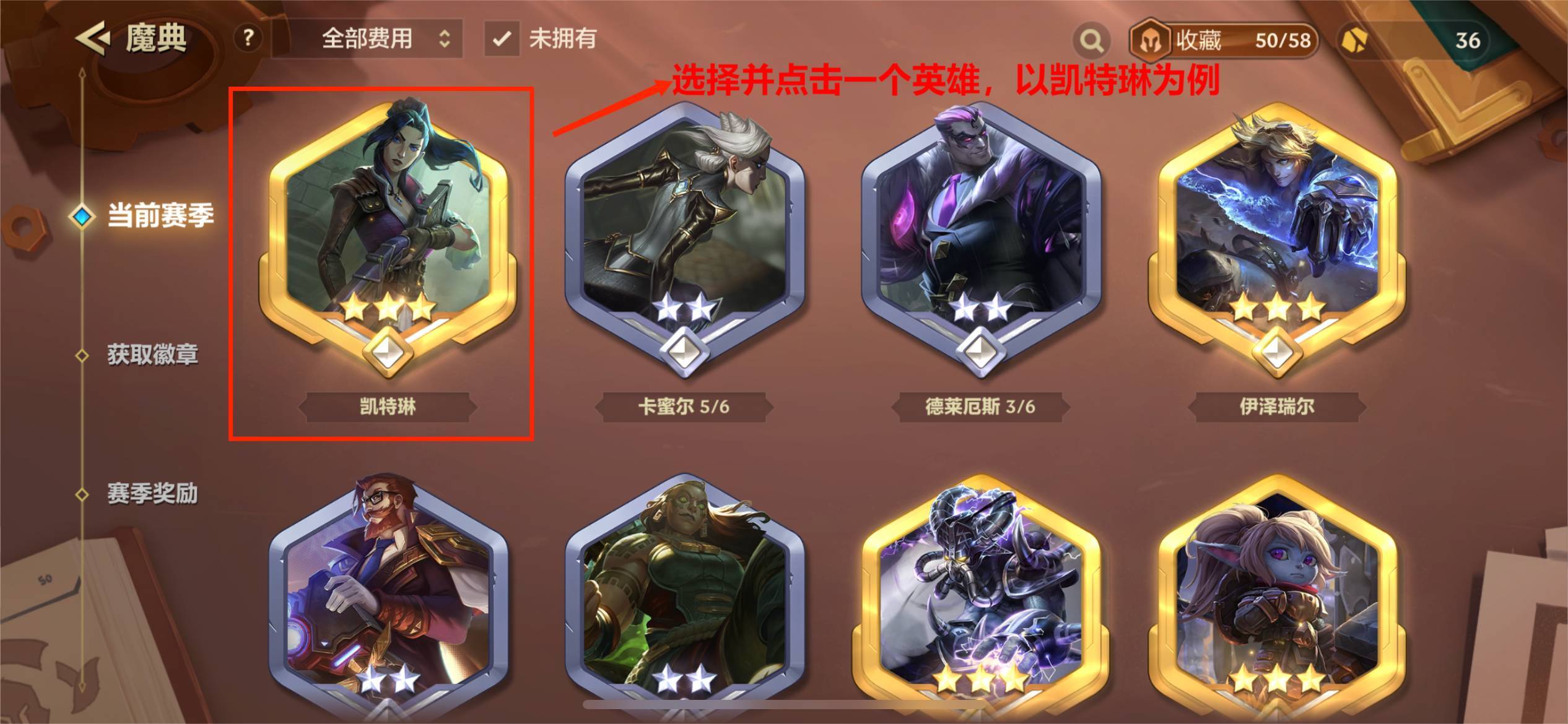 2. 打开魔典界面后,挑选并点击一个英雄(这里以凯特琳为例),选定凯特琳。