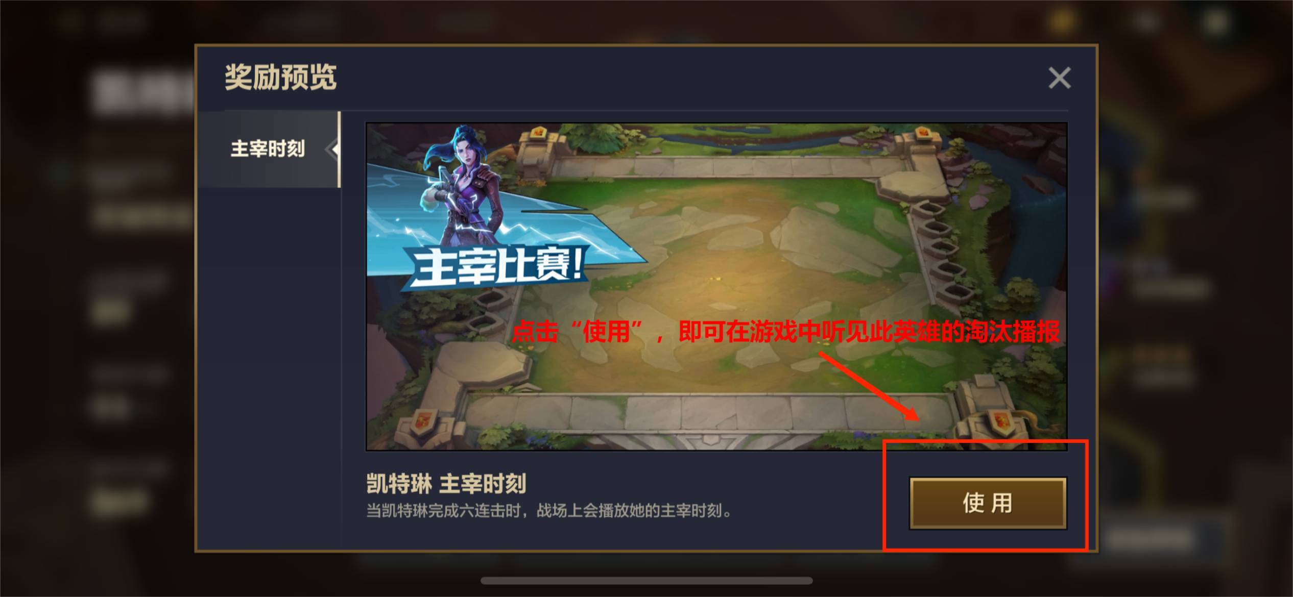 4. 在右侧选定类型后,点击“奖励预览”就能查看淘汰播报,点击“使用”按钮即可完成操作。