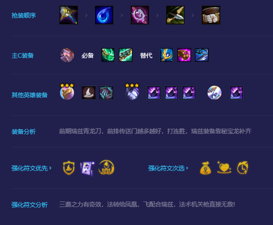前期建议先把蛙哥培养起来!阵容搭配上3法2驯龙,瑞兹的装备可以给小炮。
