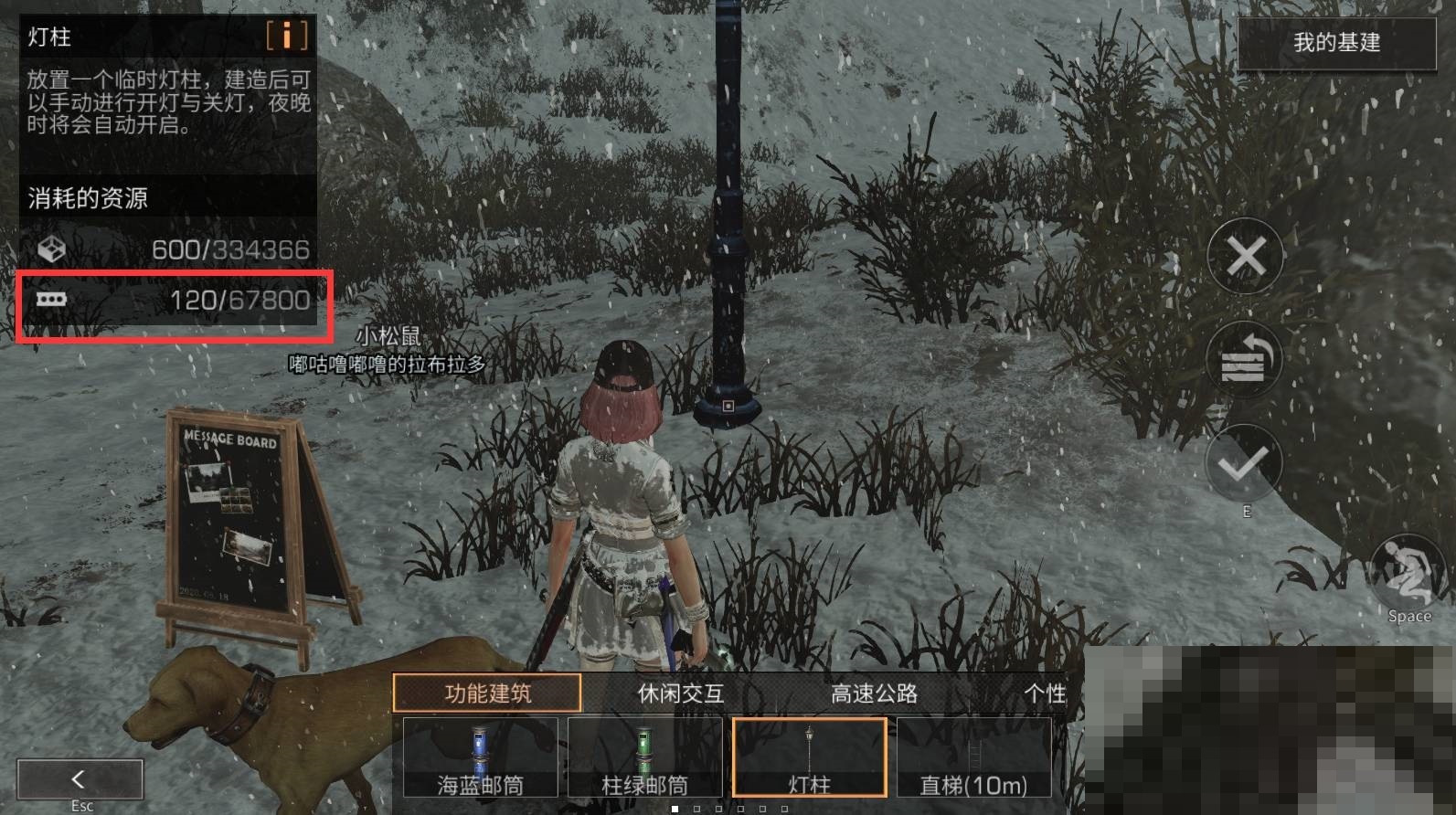 2、在建造界面挑选你想要搭建的物品,像路灯这类,点击右边的确认按钮就能完成建造,建造过程中会消耗复合建材。