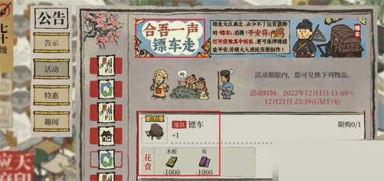 镖车获取方式:点击进入州府界面,找到公告板块,在活动栏目中选择【合吾一声镖车走】,消耗1000木板和1000布这两种资源,即可兑换获得镖车。