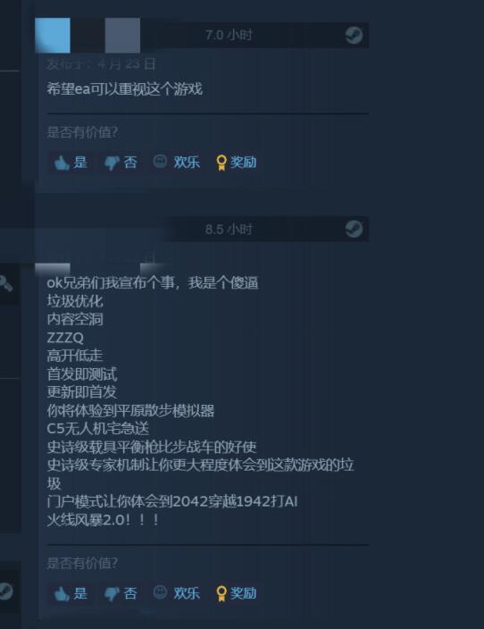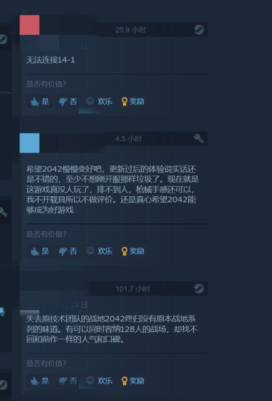 这次更新之后,Steam平台上有一些玩家反馈称游戏体验比刚发售时提升了很多,国外的社交媒体上也出现了不少类似的好评。不过可惜的是,《战地2042》的玩家流失情况实在太严重,现在想匹配到对局都比较困难。另外,还有玩家提到游戏的优化问题一直没有得到妥善解决。