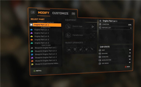 车辆的装备升级组件涵盖火焰喷射器、紫外线大灯、防撞护栏等装置,此外还有40种不同的喷漆可供选择,以及众多能够增强战车破坏力、马力等各方面性能的小型配件。