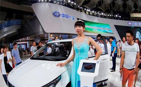 2015年7月12日,在长春市汽博会的中国一汽展台前,有人发现一名身着绿色长裙的女子站在一辆汽车旁担任模特。