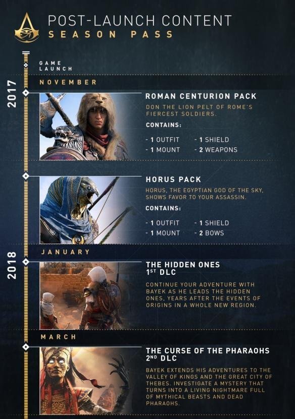 DLC1-无形者:该篇章的故事设定在游戏本体剧情结束之后,围绕刺客兄弟会与罗马占领势力的战斗冲突展开叙述,此外,此DLC还会提高玩家的等级上限。预计于2018年1月推出。