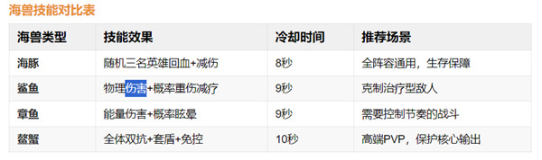 2、海豚是万能选择,能为随机三名英雄回血并赋予减伤效果。鲨鱼则对敌人造成物理伤害,并有概率施加重伤减疗效果,克制天使欧玛与生命回收词条。