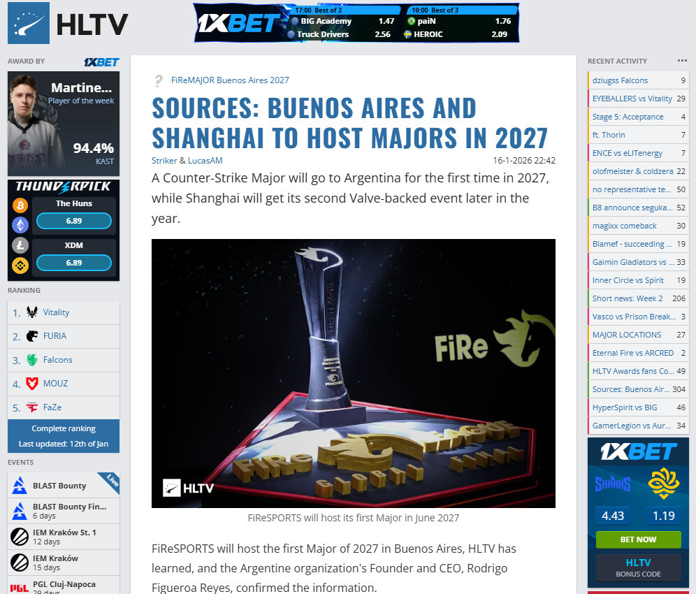 根据反恐精英媒体HLTV的消息,阿根廷布宜诺斯艾利斯计划在2027年5月迎来首个Major赛事,紧接着同年11月,中国上海将承办第二个Major赛事。