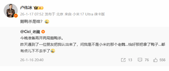 今日,小米集团合伙人、总裁,手机部总裁,小米品牌总经理卢伟冰转发了魏思琪的动态,并以真诚的语气发文询问:“鹅鸭杀是啥?”