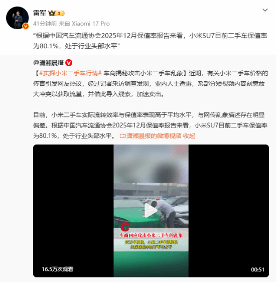 小米创办人、董事长兼CEO雷军今日表示:“依据中国汽车流通协会2025年12月发布的保值率报告,小米SU7当前的二手车保值率达80.1%,在行业中处于头部位置。”