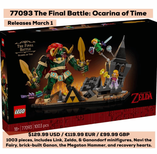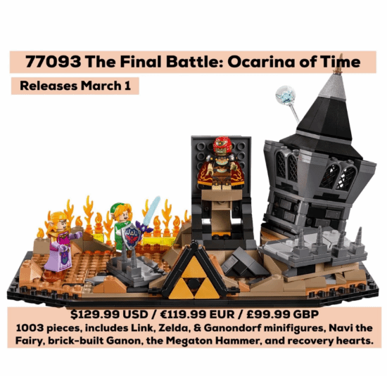 这款新品看起来是以N64经典游戏《时之笛》里林克、塞尔达和盖侬多夫的最终决战场景为原型打造的立体模型。据最新消息,它的官方名称是“77093 The Final Battle: Ocarina of Time”,总共由1003片积木组成,里面有林克、塞尔达、盖侬这几个角色,还有不少小配件。