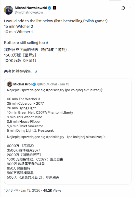 在这部作品的带动下,系列前两部作品也持续受到新老玩家的喜爱:《巫师2》销量达到1500万份,《巫师》第一部作品的销量也突破了1000万份。到目前为止,《巫师》整个系列三部曲的累计销量已经高达8500万份。