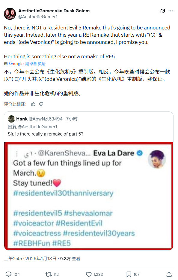 此前准确透露里昂将在《生化危机9》中登场的知名爆料者Dusk Golem发推表示,卡普空今年不会公布《生化危机5:重制版》;他同时透露,“取而代之的是,今年晚些时候会公布一款以‘(C)’开头、以‘(ode Veronica)’结尾的RE系列重制版作品”。这意味着,下一款迎来重制的《生化危机》游戏正是《代号:维罗妮卡》。