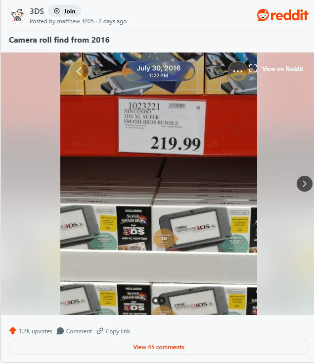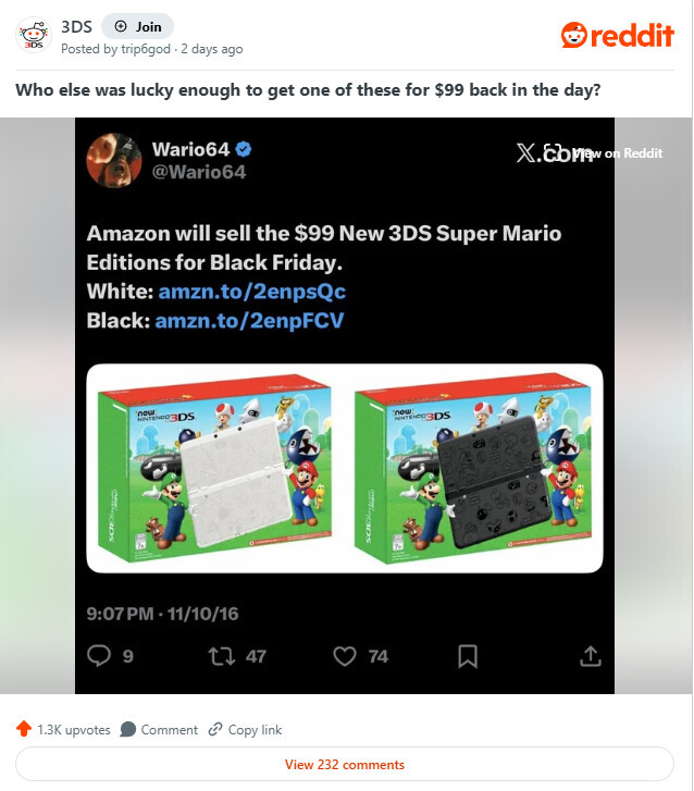 在r/3DS论坛上,有位玩家分享了折扣猎人Wario64于2016年黑色星期五发布的一条旧促销消息:New Nintendo 3DS仅售99美元。这让所有看到的人都懊悔不已。