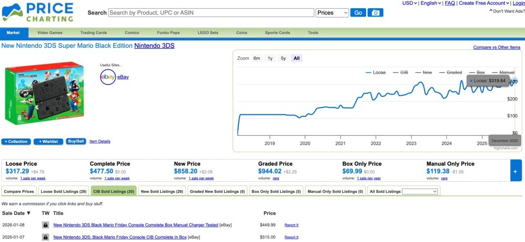 时至今日,据PriceCharting消息,超级马里奥“黑色版”3DS的售价已不低于300美元,若要入手盒装完整版(CIB)或全新未拆封版本,价格还会进一步上涨。