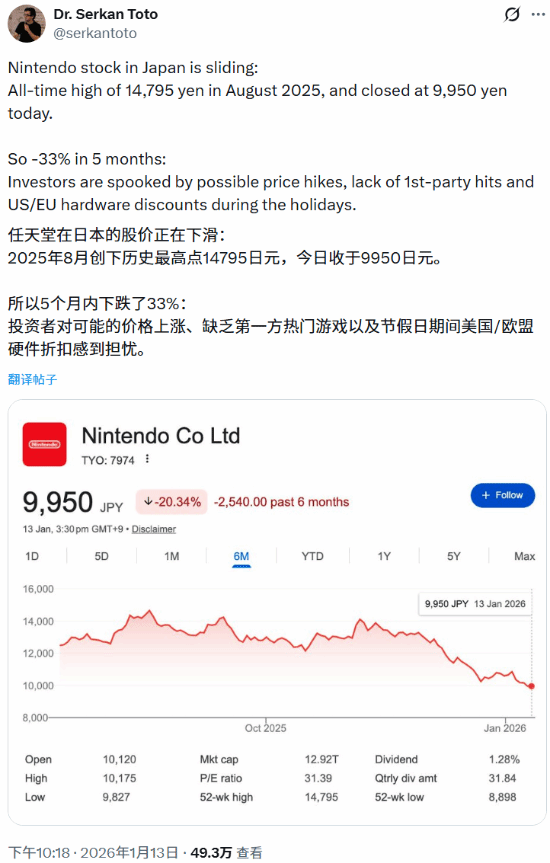 Switch 2在发售初期的市场表现极为亮眼:到2025年底时,其销量已快速突破1000万台,一举成为任天堂历史上首发表现最出色的主机。不过,与之形成强烈反差的是,公司股价在2025年8月达到14795日元的高点后,就开始持续下滑,如今已经跌到了9950日元上下。
