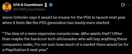 不过,在业内极具影响力与权威性的记者杰森·施赖尔(Jason Schreier)眼中,PlayStation 6于明年就能摆上商店货架的设想,是根本不切实际的。