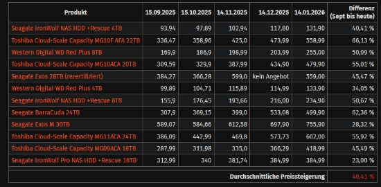 根据Computerbase.de的数据显示,近几个月来硬盘价格出现了显著上涨。自9月15日开始,12款容量介于4至30 TB之间的硬盘,其零售价涨幅达到了23%至66%。
