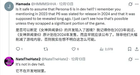针对外界的这一质疑,Nate the Hate给出了简短而明确的回应:“并未陷入开发困境”。这一表态直接消除了外界对项目开发受阻的担忧,同时也暗示《女神异闻录6》目前进展顺利,发行商Atlus或许已经选定了其他更合适的时机和场合,来正式公布这款备受期待的重磅新作。