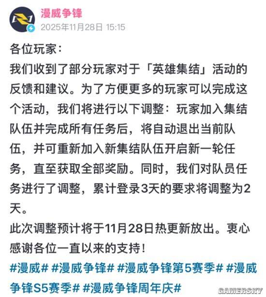 近期开启的周年庆英雄集结活动,部分玩家反馈完成门槛较高,官方迅速响应并通过热更新降低了活动难度。不仅将累计登录3天的任务调整为2天,还优化了组队机制:玩家加入集结队伍完成所有任务后会自动退队,可重新加入新队伍开启新一轮任务,直至获取全部奖励。从这一调整不难看出,官方确实希望让更多玩家能拿满奖励,而非为了所谓的“用户粘性”刻意增加玩家负担。