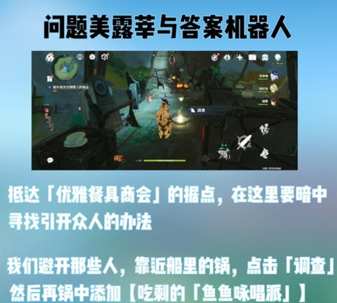 •汇合后一同前往位于水下的「优雅餐具商会」据点,在此需暗中设法引开众人,可向锅中加入「佐料」——【吃剩的「鱼鱼咏唱派」】来达成目的