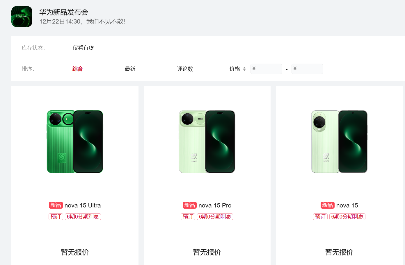 12月15日消息,华为官方今日正式对外发布通知:华为nova 15系列手机与全场景新品发布会定于12月22日14:30召开。
