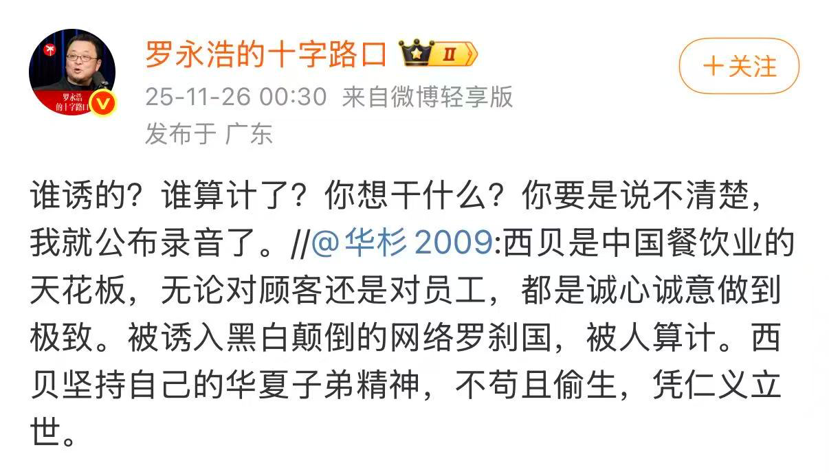 今年9月,西贝意外陷入“预制菜争议”。罗永浩通过微博表示,自己所食用的西贝菜品几乎均为预制菜,这一言论瞬间让西贝成为舆论焦点。作为西贝的长期品牌合作方,华与华的华杉亲自出面支持西贝,甚至将罗永浩称作“网络上的不实言论者”。