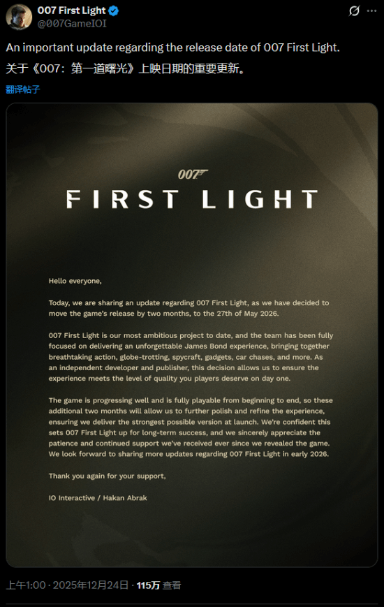 IOI还补充说明,会在2026年初公布更多有关《007 初露锋芒》的信息,敬请各位玩家期待。